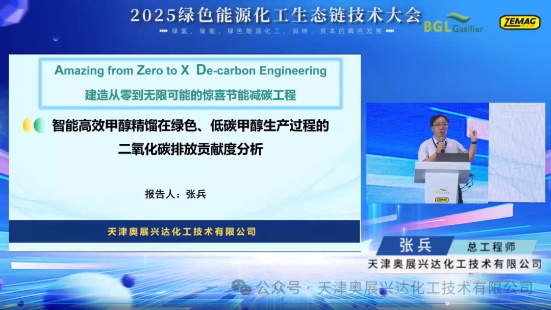2025年6月24日-26日,天津奥展兴达总经理张兵在上海参加2025绿色能源化工生态链技术大会。大会旨在为不同的从业者提供一个学术、产业与理念的交流平台,为与会者提供更开放的环境和更宽广的视野,从而共同推动绿色能源化工事业的健康发展。 本次会议聚焦绿色能源化工产业的高质量发展,邀请政府领导、行业协会、企业、科研院所及技术装备服务商等各界代表参会。围绕政策动向、原料保障、技术升级、碳足迹核算、市场拓展等关键议题,近30位嘉宾发表演讲,探讨行业机遇与挑战。会议旨在促进技术共享、标准共建、资本合作,推动我国绿色能源化工产业可持续发展,助力企业抢抓市场机遇,实现低碳化、智能化转型。 总经理张兵在会上发表演讲,介绍公司先进甲醇精馏技术。天津奥展兴达拥有20余项甲醇精馏专利技术,适用于各种场景,多个甲醇精馏专利技术已有工业应用案例,蒸汽单耗最低可达0.36t蒸汽/t精甲醇。 我司为河南心连心年产30万吨甲醇精馏装置设计的改造项目,采用五塔3+3效-II型方案。原粗甲醇中乙醇含量600ppm,产品原指标为控制乙醇含量≤50ppm,原蒸汽耗量约为1.05t蒸汽/t精甲醇。通过技术改造,精甲醇中乙醇含量降低到10ppm以下,同时蒸汽能耗降低到0.65t蒸汽/t精甲醇以下。改造后的精醇指标满足美国AA级标准及国标优等品,每年节省的运行费1950余万元,投资回收期约为10个月。 该技术已通过中国氮肥协会的科技成果鉴定,达到国内领先水平。 奥展兴达在会议上展示了原创的煤炭-生物质-水-硅/盐-空气-风-阳光-绿电耦合制造低碳溶剂、材料与燃料等产业链及技术路线图,从煤炭为原料出发,延伸到下游产品,标明了生成路径及应用领域,兼顾可再生能源路径与绿色产品发展方向,为业主单位、设计院等相关人员提供参考,受到了与会嘉宾的一致好评。 天津奥展兴达化工技术有限公司将“节能增效、环保治理”作为总目标,是集研发、设计、制造、销售、服务于一体的综合性企业,是为流程工业定制化提供具有行业领先性的高效节能装备与技术的解决方案提供商,为客户带来显著经济效益和环境效益。天津奥展兴达将用自己的先进技术,专业的服务,助力低碳和零碳型社会转型,在可持续发展的道路上,共同推动绿色能源技术的发展,为人类创造更加清洁、可持续的未来。 低碳热泵及热耦合技术:一系列甲醇精馏节能专利技术(非热泵路线,每吨精甲醇蒸汽单耗从1.2最低可降至0.36,热泵路线精甲醇蒸汽单耗降至 0.12)。苯加氢工艺节能,能耗降低30%以上。双效蒸氨工艺。热泵脱苯工艺,也是我公司优势技术。 热泵精馏技术:实用新型专利2项。与传统技术相比,采用热泵技术可以节能20-60%,每年为企业创造经济效益高达上千万元,节能减碳效益明显。此技术开创性的应用于CCUS工艺,二氧化碳成本降低50-70%。 氮气循环汽提精馏技术:适合热敏、高沸点物系分离,与干熄焦工艺结合,实现废机油的高效回收利用。 节能高效兰炭酚氨废水治理技术:公司开发的专利抗堵塞塔器内件设备和专利节能工艺包以及专利萃取剂配方,专利布局4个以上,已经申报发明专利2项,能耗降低20-30%,硫酸、烧碱的用量可降低30%左右,回收20%的氨水、粗酚等有价值的化学品,废水经过生化处理或者通过树脂吸附达到稳定达标排放。 奥展兴达